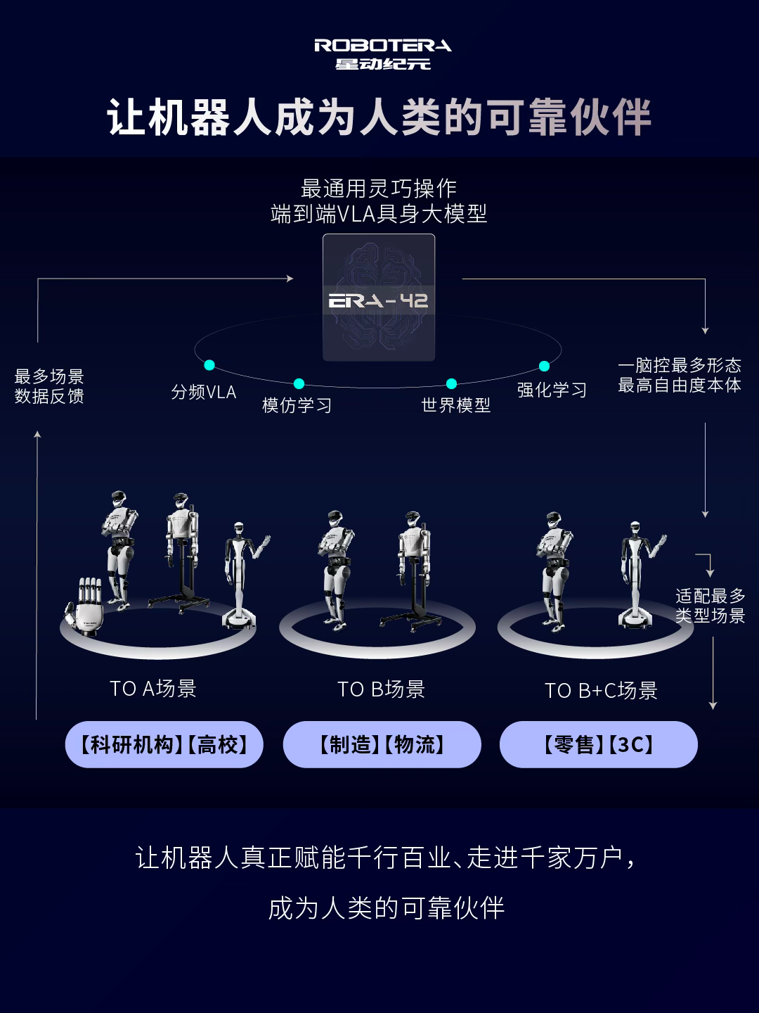 星動紀元堅持“具??腦”與“?形本體”軟硬?體全棧自研,通過打造通用大腦及通用機器人,讓機器人成為人類的可靠伙伴。星動紀元具身大腦ERA-42已實現對高自由度全尺寸雙足人形機器人全身及五指靈巧手的精準控制,并在物流領域、商業服務行業應用。